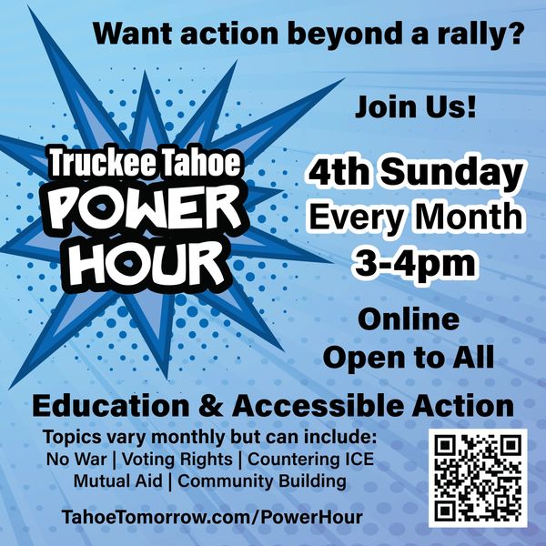 Truckee Tahoe Power Hours provide opportunities to take action outside, between, and beyond demonstrations. Power Hours allow community members involvement in local pro-democracy advocacy, whether we can attend demonstrations in-person or not. Power Hours also allow us to share ideas and build connection between and outside of demonstrations, whether we are full or part time residents.